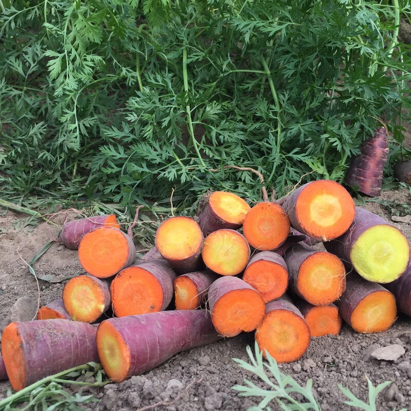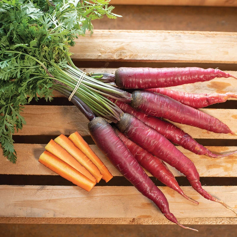 Well-known for its beautiful magenta-purple skin and broad, Chantenay-type shoulders. Slicing reveals a surprise of orange or yellow interior, sometimes both. Very thin, smooth skin makes Dragon easier to wash and serve unpeeled than other purples. Roots hold well in the field. Tops are strong and vigorous in early growth to compete with weeds. Internal color will vary. Avg. 5–7″ long. Originally bred by our own Dr. John Navazio. Kuroda x Chantenay type. Also available with NOP-compliant pelleting.