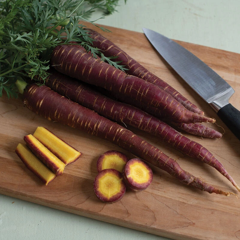 The rich purple skin contrasts nicely with its core and striations, which are both a beautiful yellow hue. Roots are 7–9″ tapered. Tolerant to spring bolting. Imperator type.