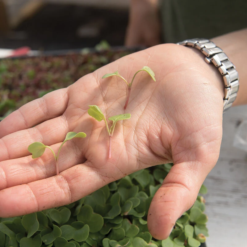 One of our fastest-growing microgreens! Uniform, medium-green leaves with pink stems. Micro radish leaves add spicy flavor, visual appeal, and bulk to mixes. Based on our yield trial, we recommend seeding 24.5 gm per tray at approx. 1 flat per oz of seed. Avg. days to maturity was 8 days when harvested at the first true leaf (as opposed to cotyledon) stage.