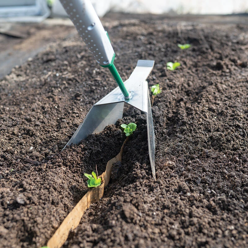 Cut a trench in the soil using the angled opening blade. Flip it over to fill in the furrow using the contoured closing blades.